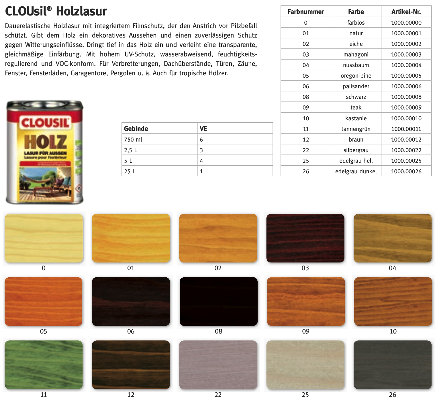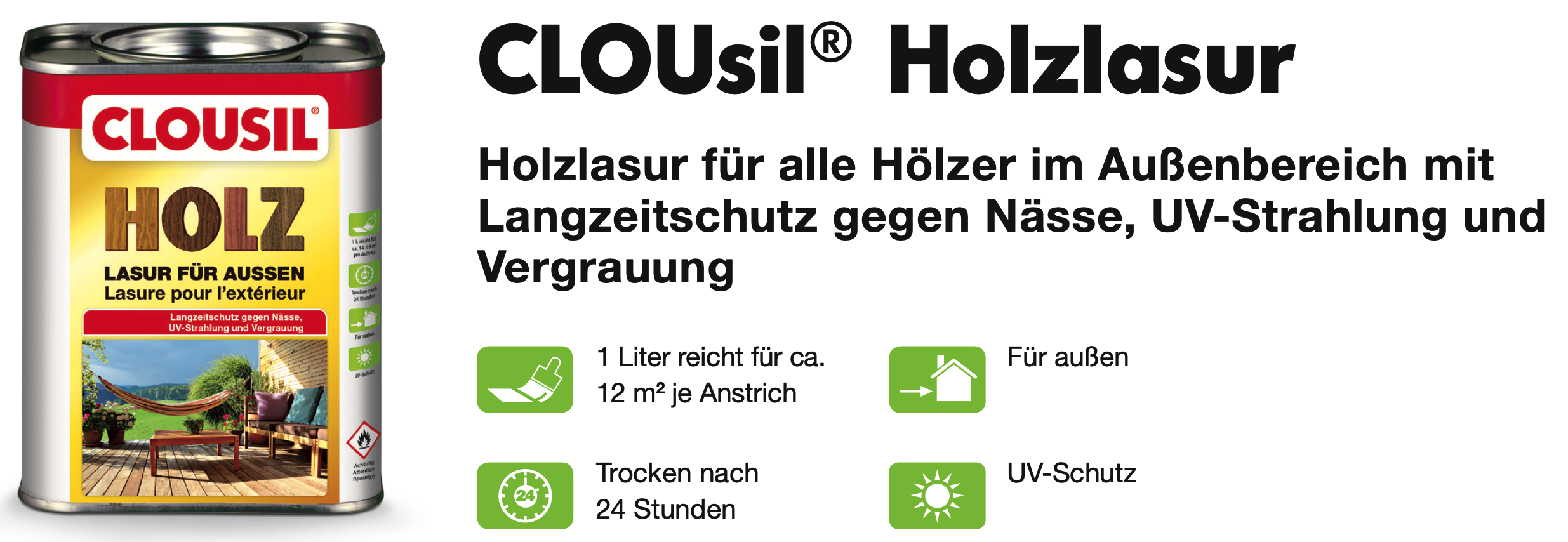 Holzlasur für den Außenbereich. Gibt dem Holz ein dekoratives Aussehen und einen zuverlässigen Schutz gegen Witterungseinflüsse.Dringt tief ins Holz ein und betont die Holzmaserung bei gleichmäßiger Einfärbung.Langzeitschutz gegen Nässe, UV-Strahlung und Vergrauung.Der Anstrich ist atmungsaktiv, feuchtigkeitsregulierend, dauerelastisch und blättert nicht ab.Enthält Wirkstoffe, die den Anstrich vor Grünbelag und Pilzbefall schützen.Die Farbtöne sind untereinander mischbar.EU-Grenzwert für das Produkt (Kat. A/e): 400 g/l (2010).Dieses Produkt enthält maximal 400 g/l VOC.